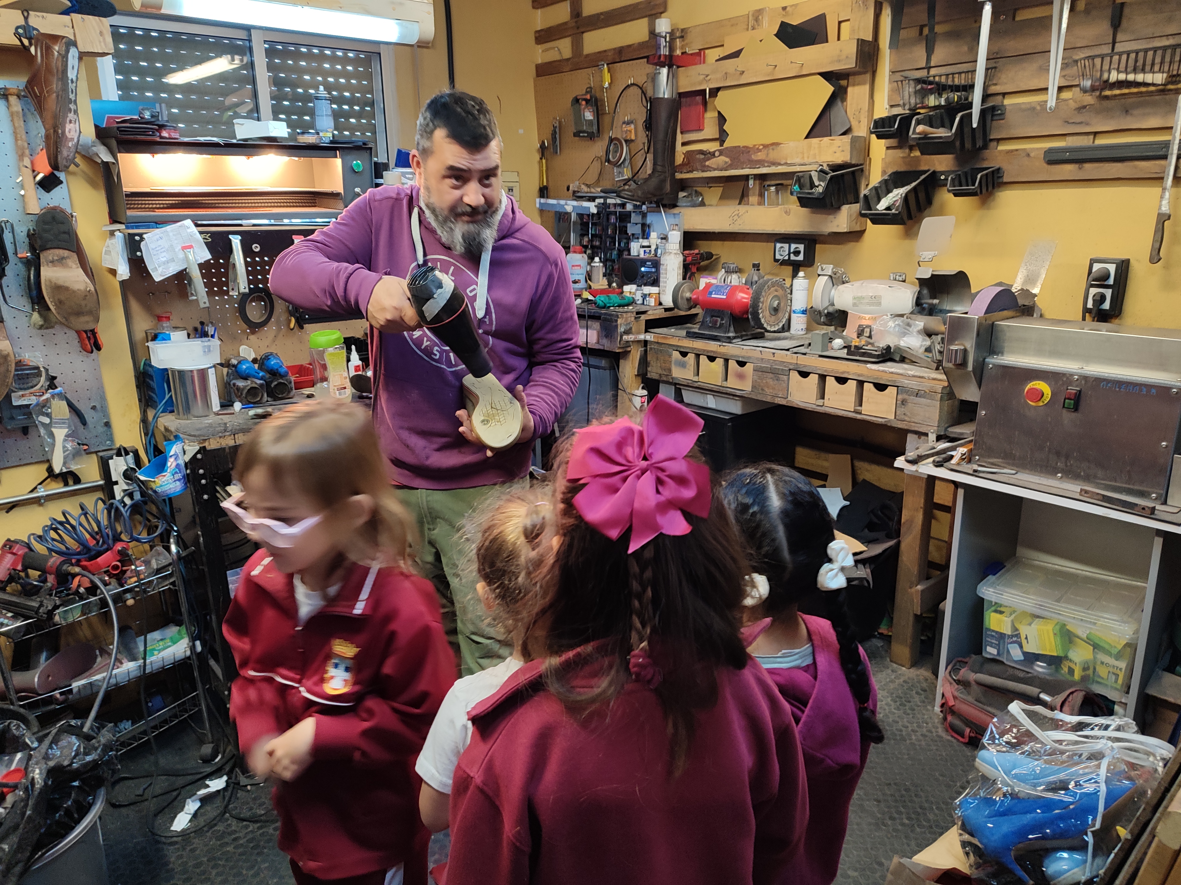 Hoy hemos realizado la excursión al taller de reparación de calzado de Peri. Nos ha encantado el enfoque ecológico que tiene su negocio, nos ha hecho mucho hincapié en la importancia de cuidar nuestro planeta, tenemos que intentar no generar tantos residuos, es por ello que es mejor arreglar, reparar y darle una segunda vida a nuestros zapatos, en vez de tirarlos. Nos ha hecho una exhibición de cómo arreglar unos deportes con la suela muy gastada, hemos podido comprobar la cantidad de pasos, procesos y maquinaria que tiene que utilizar para las reparaciones. Martín nos ha contado que también hacen copias de llaves y que él ayuda a su papá en las tareas que no son peligrosas. Hemos aprendido los nombres de algunas de sus herramientas, que curiosamente, tienen nombre de animales, preguntadnos, que nos lo sabemos muy bien 😅. También hemos podido tocar la piel que se usa en este trabajo. Otro dato importante que hemos descubierto es que nuestros zapatos tienen números y esa es nuestra talla de pié. Le hemos hecho muchas preguntas y Peri ha contestado a todas con la sonrisa que le caracteriza . Ha sido una experiencia muy novedosa y además nos ha regalado unas plantillas, así que hemos vuelto a nuestro cole super contentos.🥰